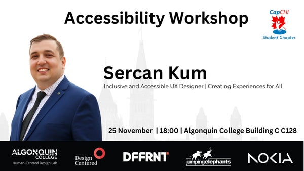 Join us for an insightful Accessibility Workshop featuring Sercan Kum, an Accessible and Inclusive Consultant! Sercan will walk us through how to create truly inclusive, end-to-end user experiences—the skill that future employers are demanding. This is a must-attend event for all students in design, IT, development, UX, and related fields who are looking to build inclusive skills. Date: November 28, 2025 Time: 6:00 PM – 9:00 PM Location: Algonquin College (1385 Woodroffe Ave, Ottawa, ON K2G 1V8), Building C, C128